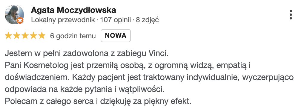 Zabieg Vinci to rewelacyjny sposób na odchudzanie i modelowanie sylwetki. Po każdej sesji czuję się tak odprężona i zrelaksowana, a moje ciało wygląda o wiele lepiej. Dzięki temu zabiegowi odzyskałam wiarę w siebie i swoje ciało, co sprawiło, że moje życie stało się pełne pozytywnej energii i radości